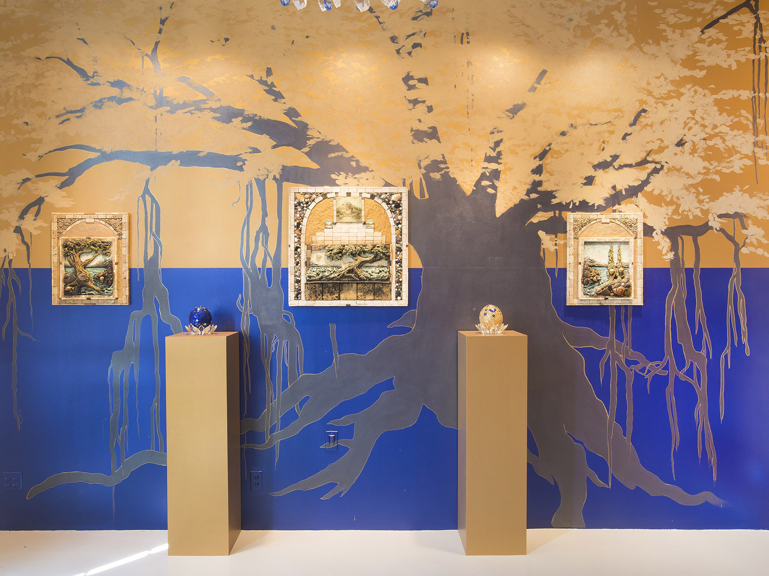 Visual Artist Tarra Bandet spent over 3 years working on the entire conceptual project, conducting research about the relationships between art and science, world history and art history, securing the final design and creating the final art work. Thousands of hours were spent formulating mixed media structures, hand cutting and placing glass, collecting symbolic objects and working them into sculptural and mixed media relief forms and painting.